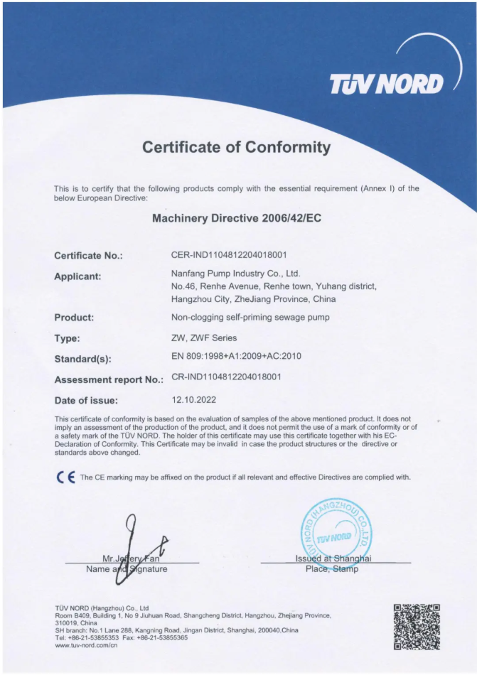 近日,南方泵业旗下南方欧科的GW(F)、NZXF、ZWL(F)、ZW(F)系列产品顺利通过欧盟严格测试与审核,成功斩获CE认证,标志着该系列产品在安全性、合规性及技术标准层面已完全符合欧盟市场准入要求,为公司进一步拓展国际市场奠定了坚实基础。